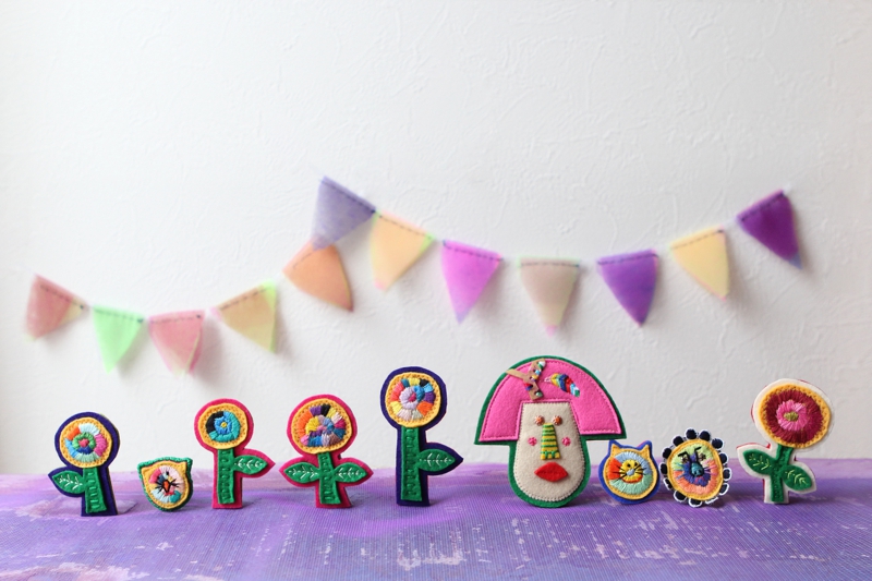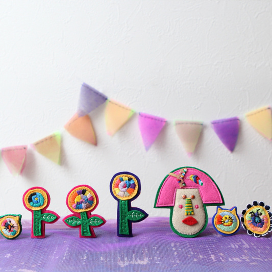 chordで作られる色鮮やかで細かな刺繍されたパーツと『ぽんめのこ』デザインがコラボしてさらに可愛い作品に変身、オシャレな指輪やブローチなどアクセサリーに!